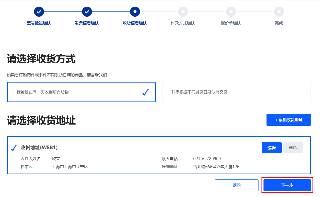 選擇收貨方式和收貨地址后,點擊“下一步”按鈕。