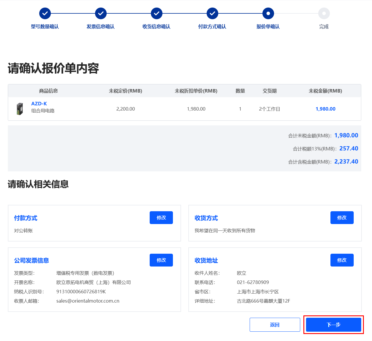 確認(rèn)報價單全部信息無誤后,點擊“下一步”按鈕。