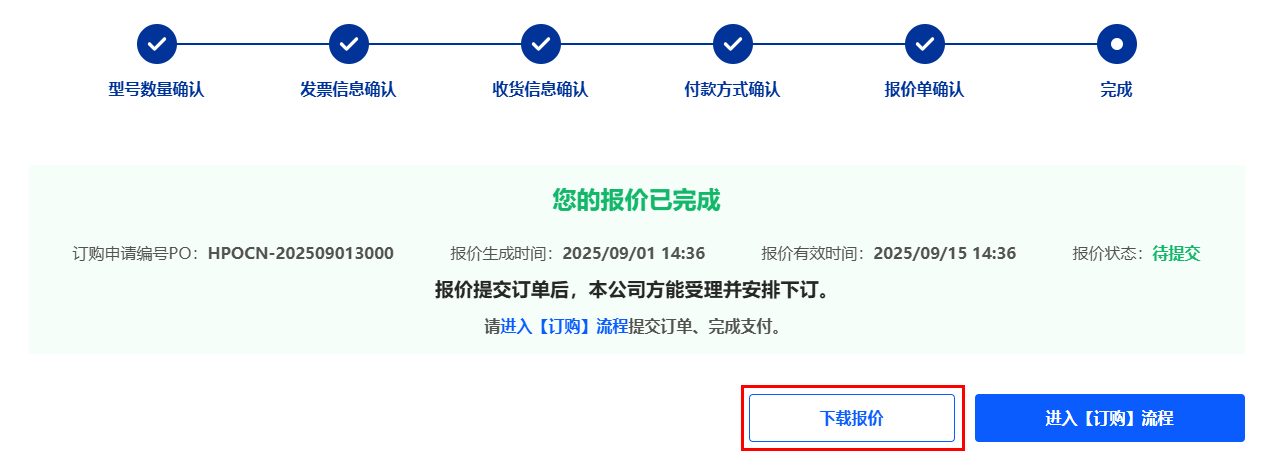 報價提交訂單后,本公司方能受理并安排下訂。如需訂購,請點擊“進(jìn)入【訂購】流程”按鈕。
