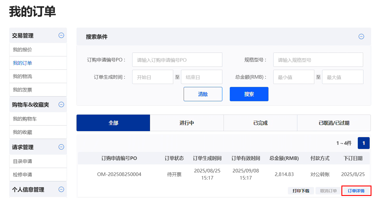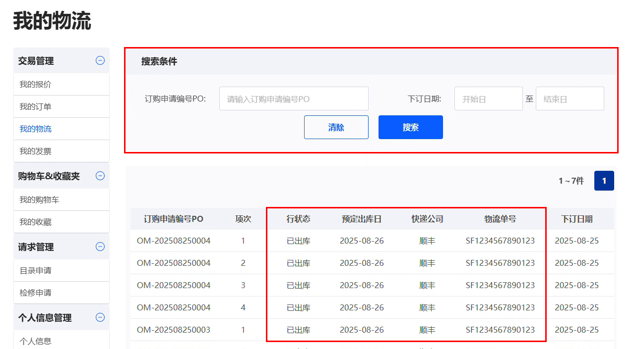 您可以通過“訂購申請(qǐng)編號(hào)PO”模糊搜索目標(biāo)訂單明細(xì)行,也可以通過“下訂日期”篩選某段時(shí)間的所有訂單明細(xì)行。