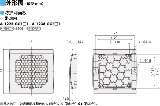 說明 濾網(wǎng)面板(1片 顏色:米色)、鐵制防護網(wǎng)(1片)、風扇安裝用螺絲、面板安裝用螺絲的套件品。