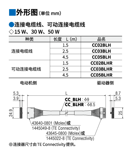 | 說明 | 電動機與驅(qū)動器間的可動式延長電纜線(1.5 m)。 |