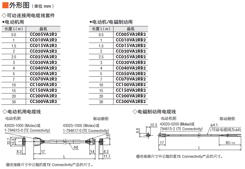 說明 電動機與驅動器間連接,或電動機與電纜線間中繼時必需的可動電動機用電纜線。請于電動機安裝在可動部,電纜線需彎曲時使用。長度5 m