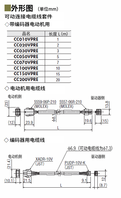 | 說(shuō)明 | 電動(dòng)機(jī)與驅(qū)動(dòng)器間的可動(dòng)電動(dòng)機(jī)用電纜線、可動(dòng)編碼器用電纜線套件。請(qǐng)于電動(dòng)機(jī)安裝在可動(dòng)部,電纜線需彎曲時(shí)使用。長(zhǎng)度15 m |