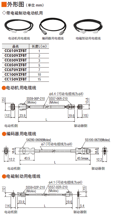 | 說(shuō)明 | 電動(dòng)機(jī)與電纜線間中繼時(shí)必需的電動(dòng)機(jī)用電纜線、電磁制動(dòng)用電纜線套件。長(zhǎng)度15 m |