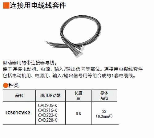 | 說明 | 可簡(jiǎn)單連接的電路用帶連接器導(dǎo)線。1個(gè)套件包括電動(dòng)機(jī)用、電源用、輸入輸出信號(hào)用電纜線。長(zhǎng)度0.6 m |