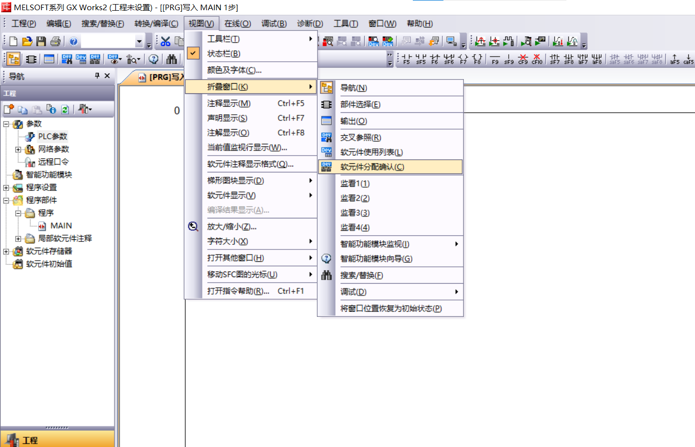 例如:在「GX Works2設(shè)置」窗口中,依次選擇[視圖]-[折疊窗口]-[軟元件分配確認(rèn)],以確認(rèn)起始地址。